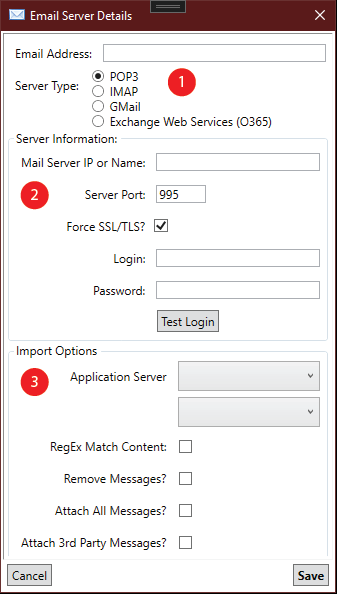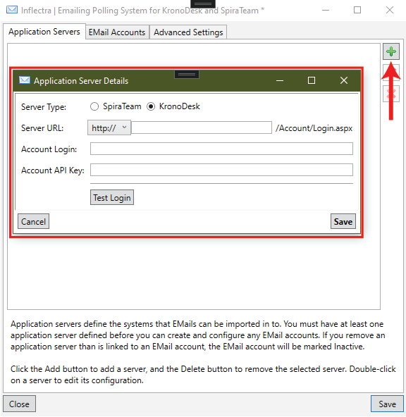 For both Spira and KronoDesk, you can then enter the different email servers that you will want to connect to: