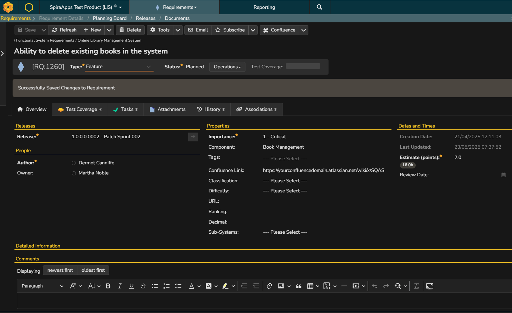 Because each Confluence page is linked directly from the requirement via a dedicated custom field, users never lose track of where supporting documentation lives. Whether you’re refining scope, writing user stories, or auditing work, everything is seamlessly connected.