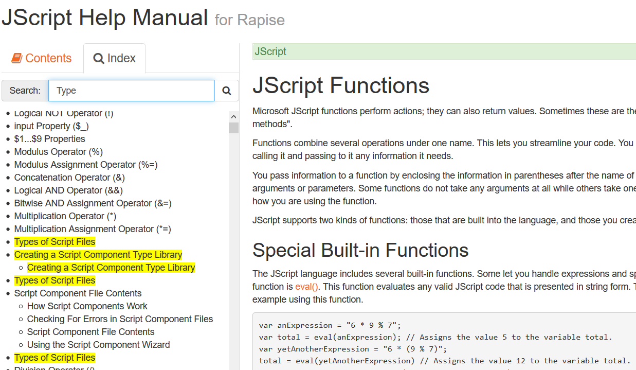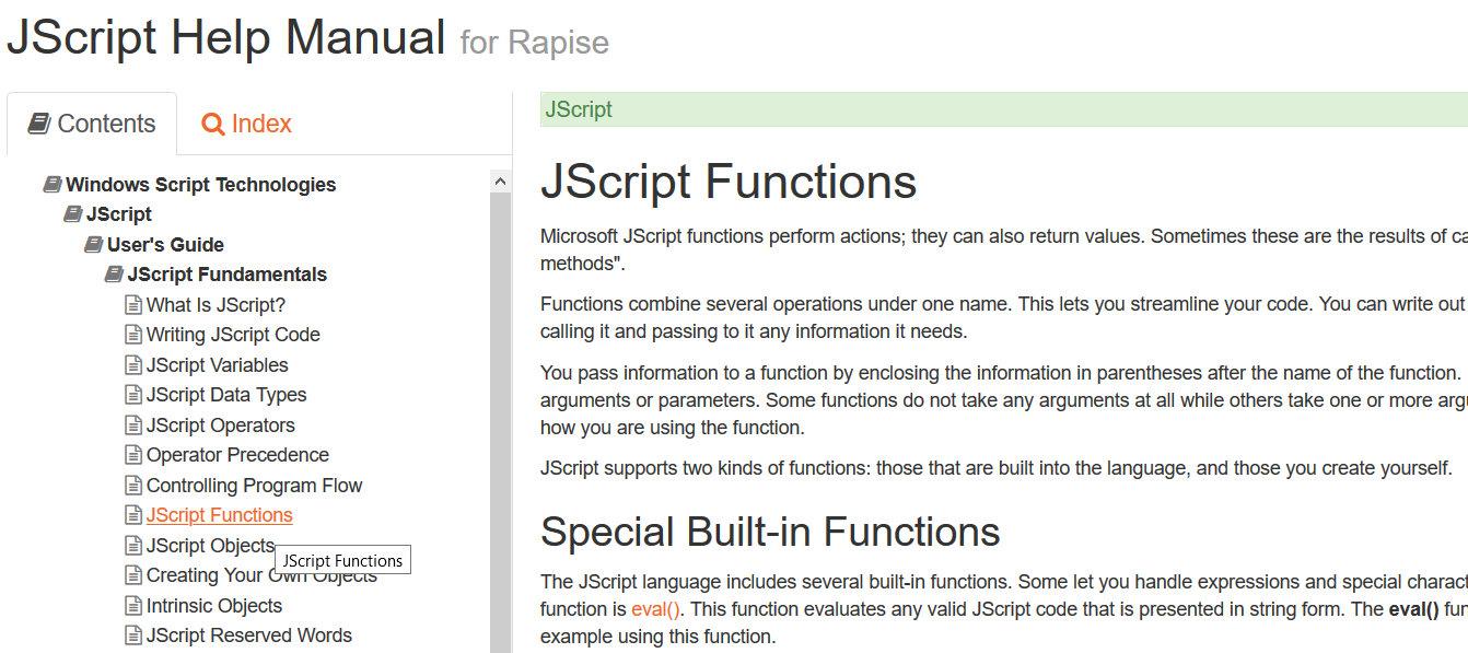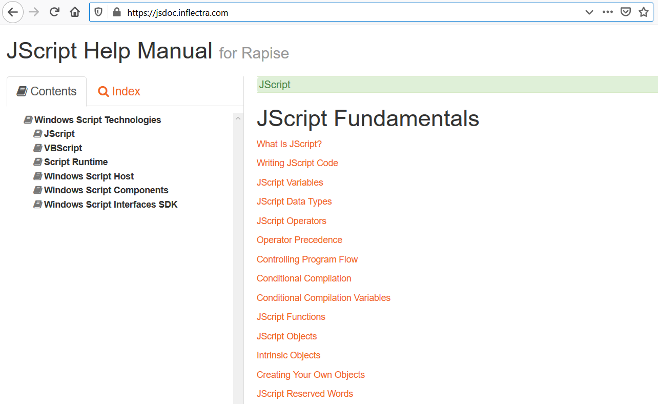 Since Rapise uses this special variant of JavaScript for its scripting, we realized that it would be very helpful to have a central repository of its language syntax and all the objects and extensions that are available. Some of these features are not Rapise-specific, but of general utility when writing automation scripts. This reference library is based on the authoritative library from Microsoft, but hosted by Inflectra to make it more accessible.