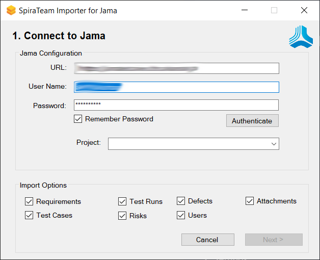 The migration wizard simply needs you to enter in the URL, login and password for your Jama instance (either cloud or on-premise is supported). You should also indicate which types of artifact you want to migrate from Jama into Spira: