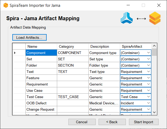 Once that is done, you then review the mapping between the Jama item types and the relevant Spira core artifact: