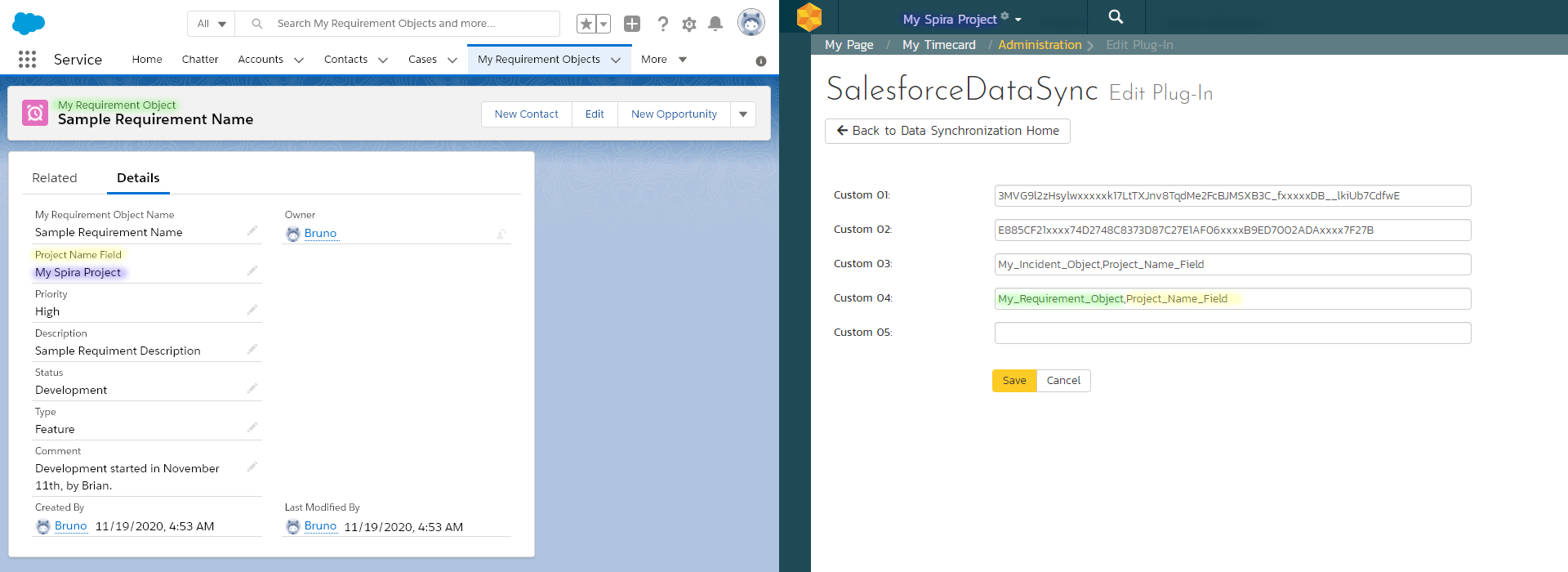 You can select a Salesforce object to sync with Incidents and another Salesforce object to sync with Requirements in Spira. To map to different projects in Spira, you will also need to designate a relevant field in each of the Salesforce objects.