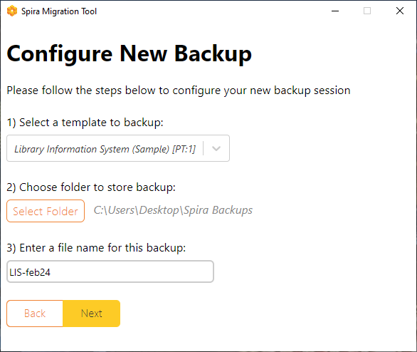 - Start New Backup: starts a new process to save a Spira product template to a template file