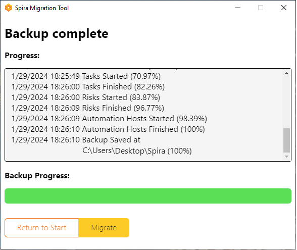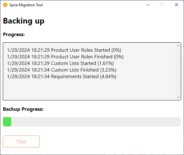 During the migration process, you will see the progress and details about what actions have been completed. If you click "Stop" during the migration, the process will pause, so you can resume it later (the new product template will not be usable in Spira until the migration is 100% completed). Just in case there are any issues or errors, the application saves a log alongside the backup file.