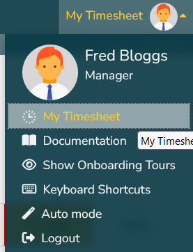 Alternatively, the My Timesheet menu entry is always available directly from the user profile dropdown menu: