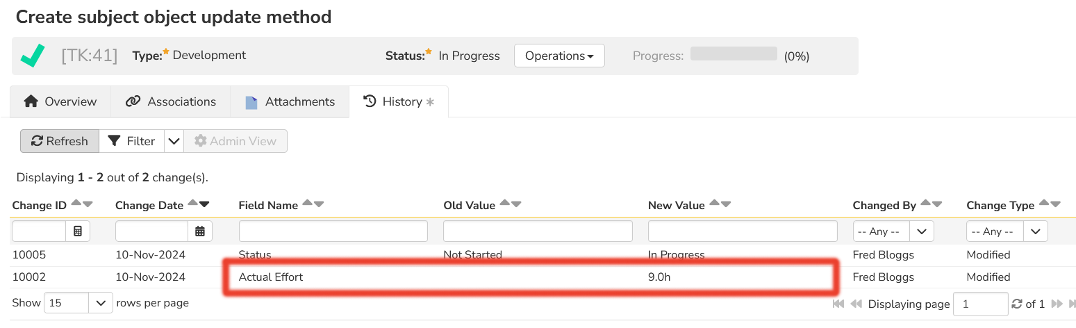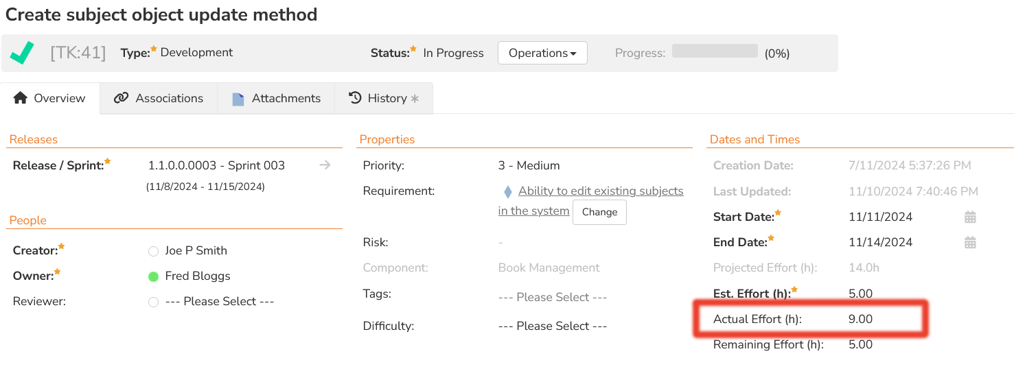 The time saved on the timesheet pages is also visible on the artifacts themselves. For example, if you view one of the tasks from the timesheet, you will see the Actual Effort field that records the time logged: