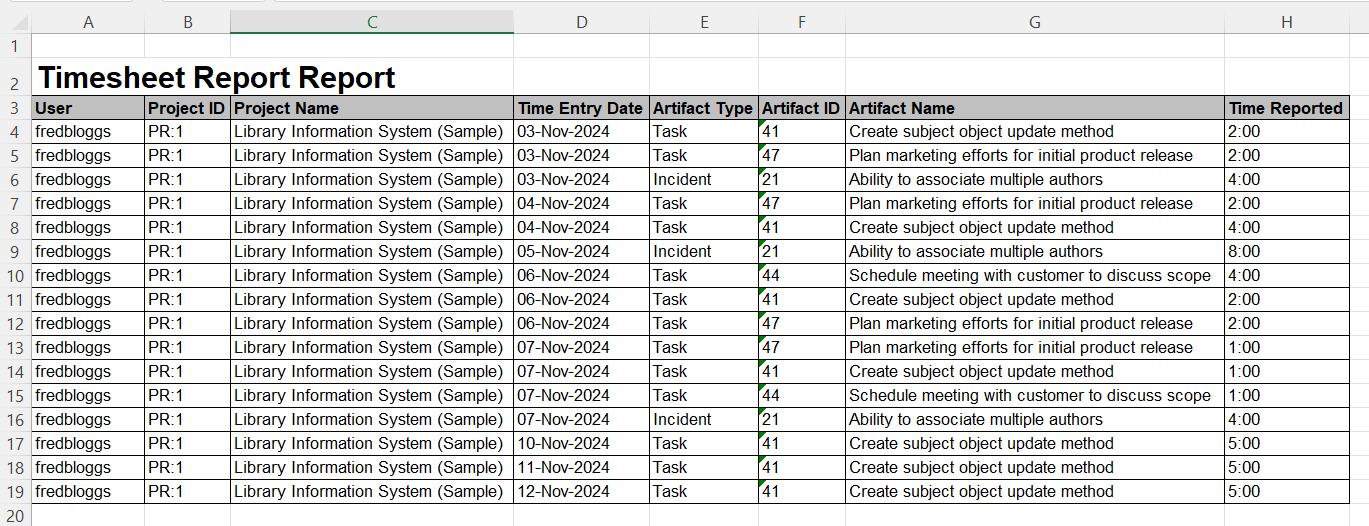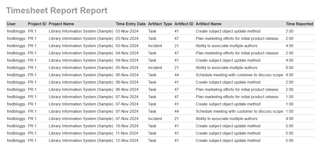 Once the timesheets have been logged and submitted, a key need is the ability to report on the timesheets and time entries logged. To make this easy, we have added new reportable entities that will let you create and run custom reports that pull the timesheet data, as well as the data related to the associated artifacts. We have some sample custom reports available to get you started in the support Knowledge Base: