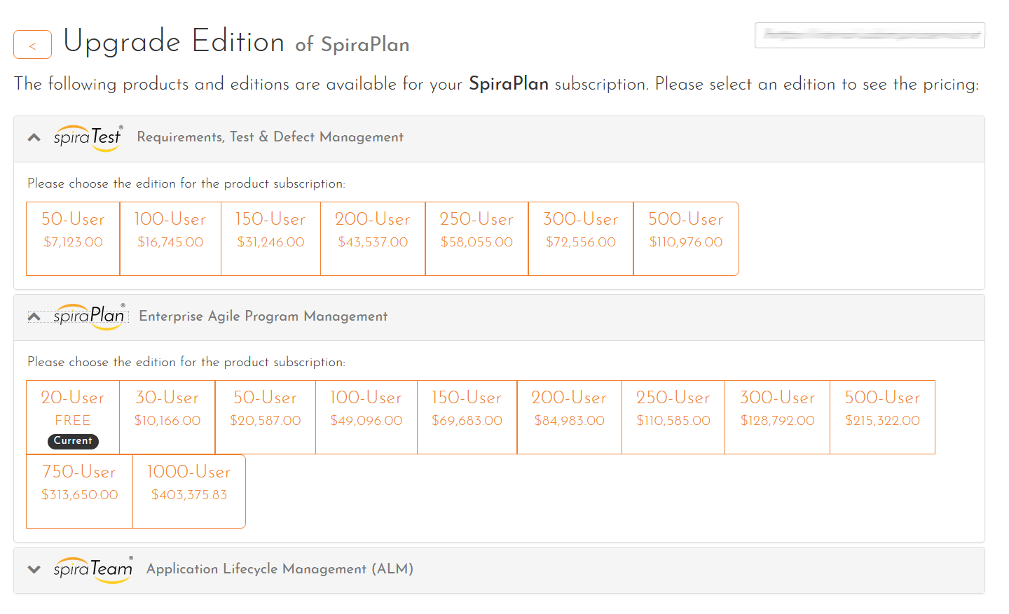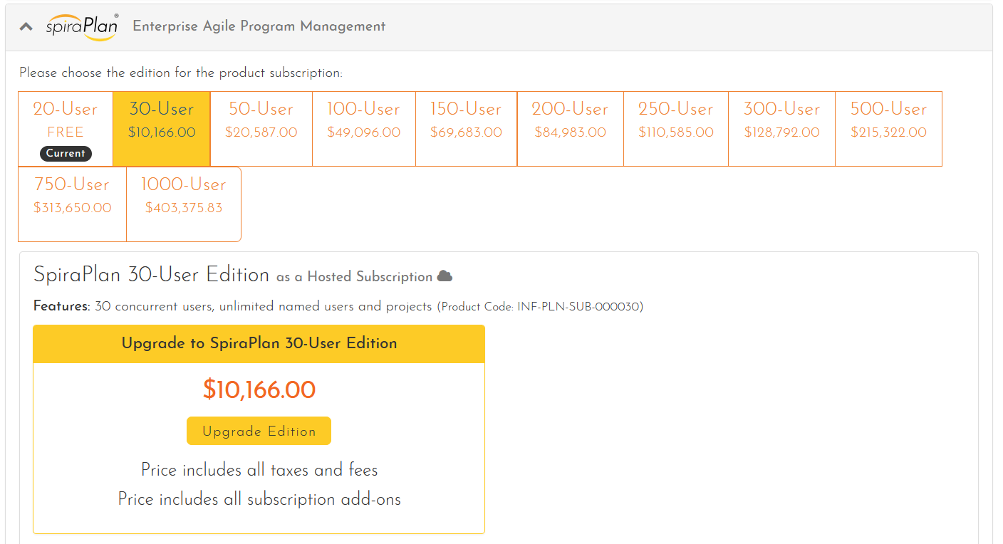 When you click on the + Upgrade button, you are taken to a new screen where you can choose which flavor (SpiraTest, SpiraTeam or SpiraPlan) and edition (number of concurrent users) of the product you want to change to.