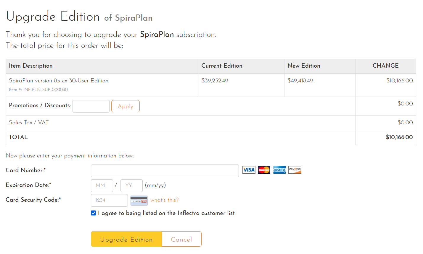Clicking the Upgrade Edition button will then take you to the page where you can enter in your payment information: