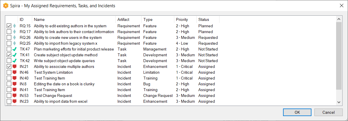 This screen will list all of the Spira requirements, tasks, and incidents assigned to you. Simply select the checkboxes of the items you want to associate with this commit operation and click OK: