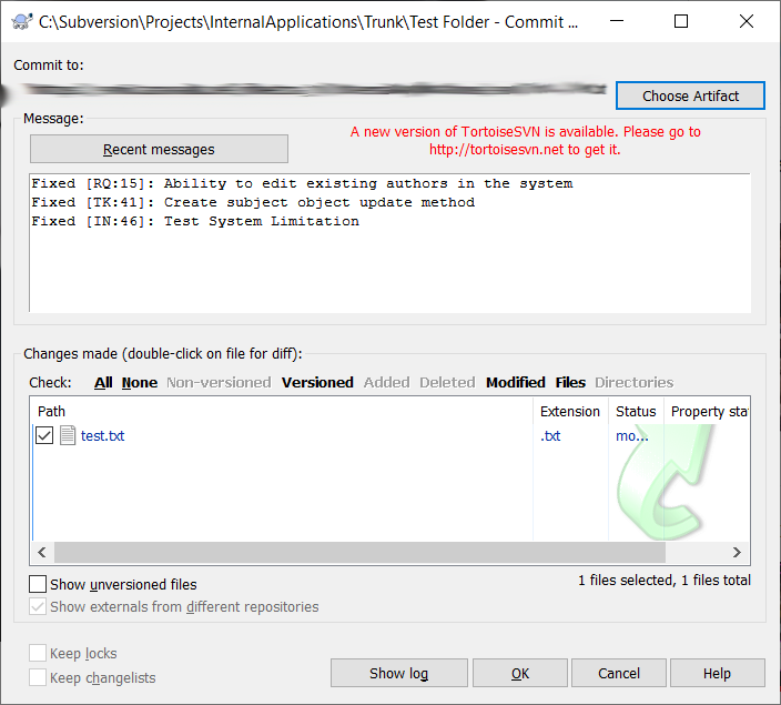 For example, you might be fixing a bug, implementing a feature, or completing a task associated with a requirement. When you choose the menu option in Tortoise to commit the change, it displays the following dialog box: