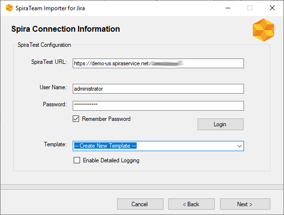 From there you can connect it to your instance of Spira (SpiraTest, SpiraTeam, or SpiraPlan) and decide whether you want to use an existing product template to create a new one 'on the fly':