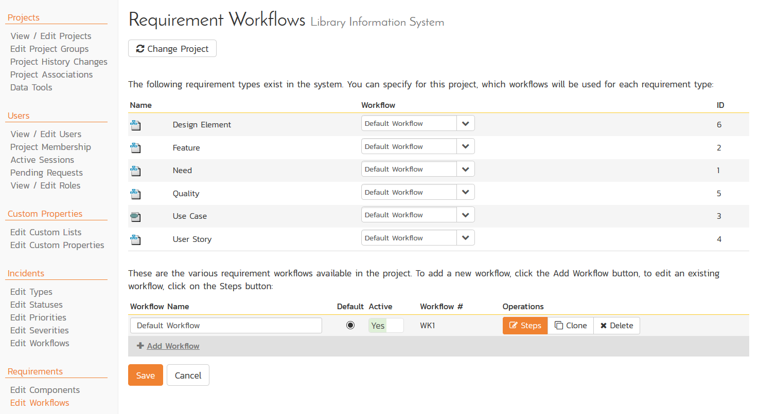 In the previous article we described how to setup the roles and permissions in SpiraTeam for a validated project. Now that this is in place, the next step is to configure the requirements workflow. To access the requirements workflow, log in as a project administrator and go to the Administration > Requirements > Edit Workflows screen: