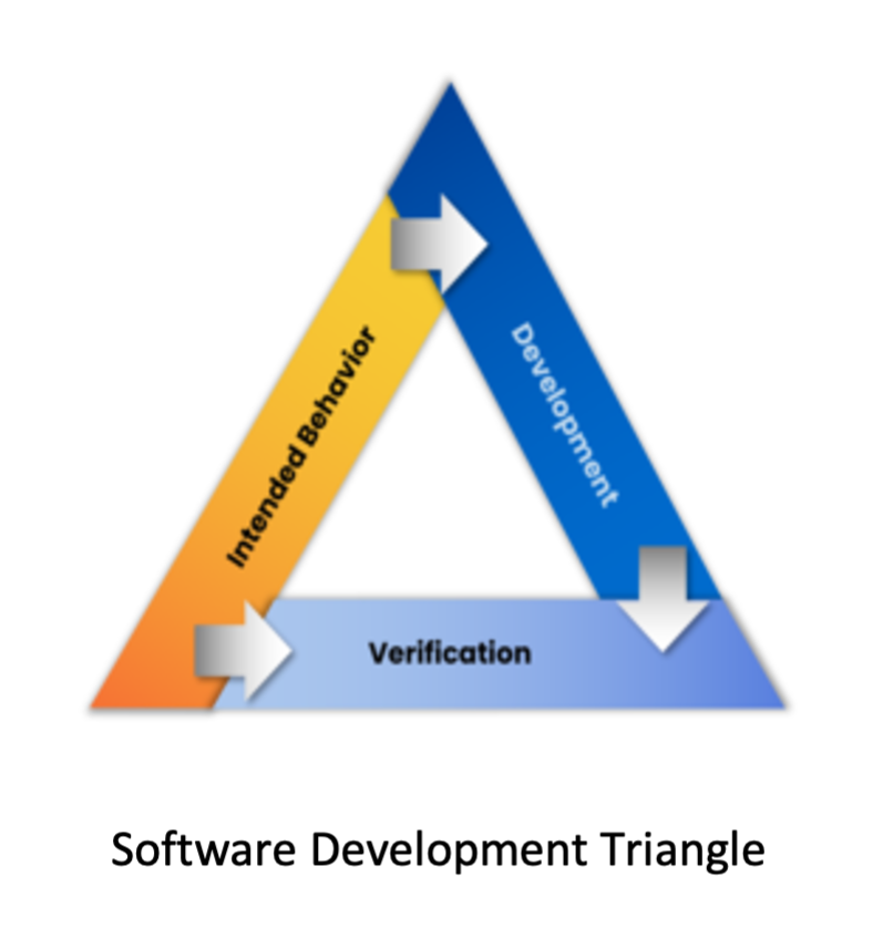 At the most basic level there are three crucial components of software development: Intended Behavior, Development, and Verification (see figure 1). These three components form a triangle, and the quality of the delivered software is directly dependent on effective communication of the ‘Intended Behavior’. Therefore, it is essential to start by defining and communicating Intended Behavior in a clear, complete, and unambiguous manner.