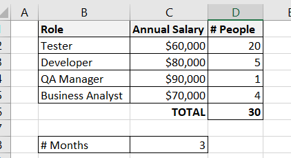The final row will contain the total cost for the project if you were to do it using your current team and tools.