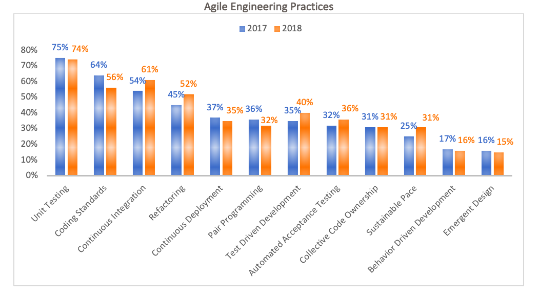 Nevertheless, we should credit agile for putting the spotlight on the engineering practices required to build quality by design. The concepts of technical debt maintenance and refactoring, for instance, have been part of agile approaches to software development for some time. One of the agile approaches, eXtreme Programming (XP), even emphasized that the continuous attention to technical excellence and good design will allow the team to respond to change rapidly. However, even the State of Agile survey didn’t report on this until recently in the last two years. So, when we look at these engineering practices that contribute to good software development, these practices are unit testing, coding standards, continuous integration, refactoring, continuous deployment, pair programming, test driven development, automated acceptance testing, collective code ownership, sustainable pace, behavior driven development, and emergent design.