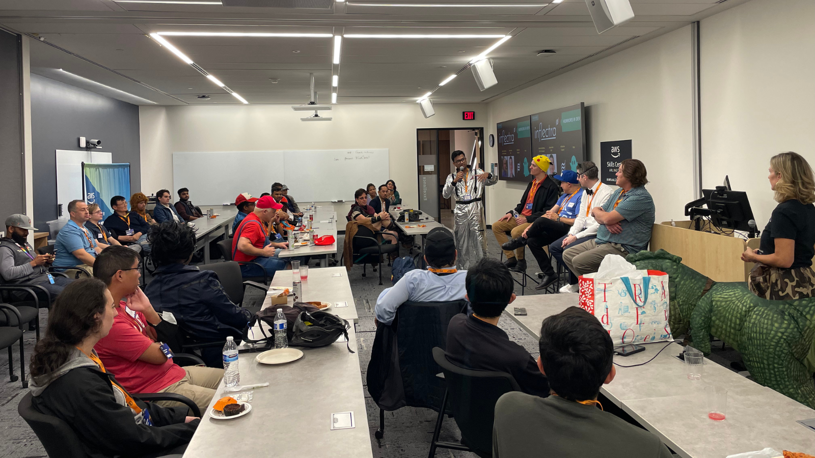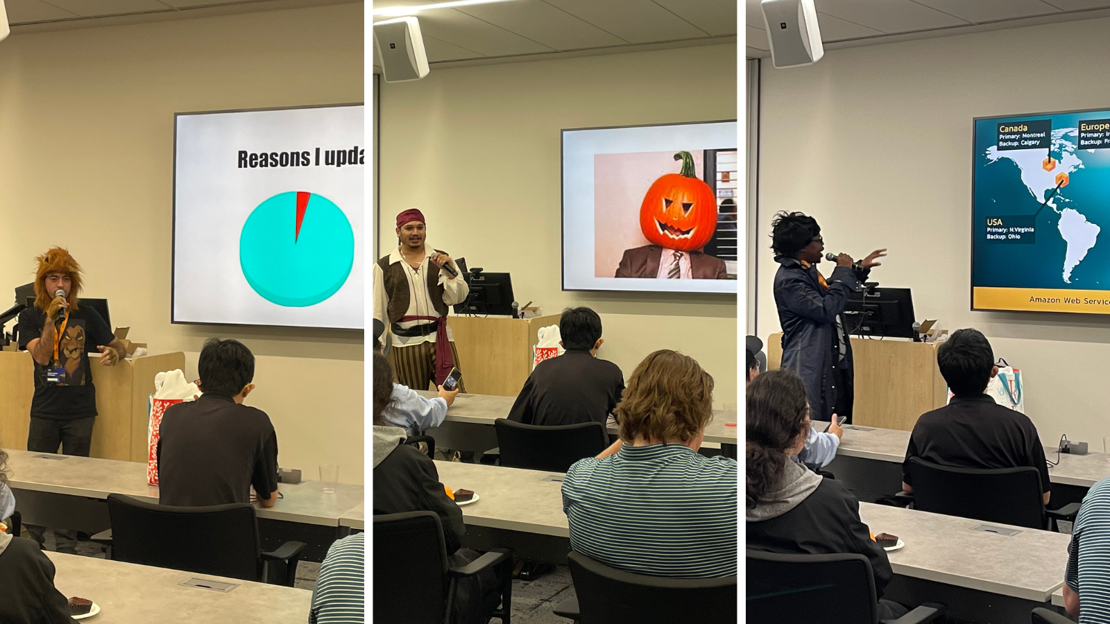 The AWS Skills Center was transformed into a den of tech terrors as attendees began to arrive. The atmosphere crackled with anticipation, fueled by spooky snacks (think "bug-infested" cupcakes and "toxic waste" punch) and the promise of terrifying tales. But before the horror stories began, a round of PowerPoint Karaoke kicked off the night, injecting a dose of hilarious chaos. Participants were given slides they'd never seen before and tasked with presenting them with confidence and charisma.