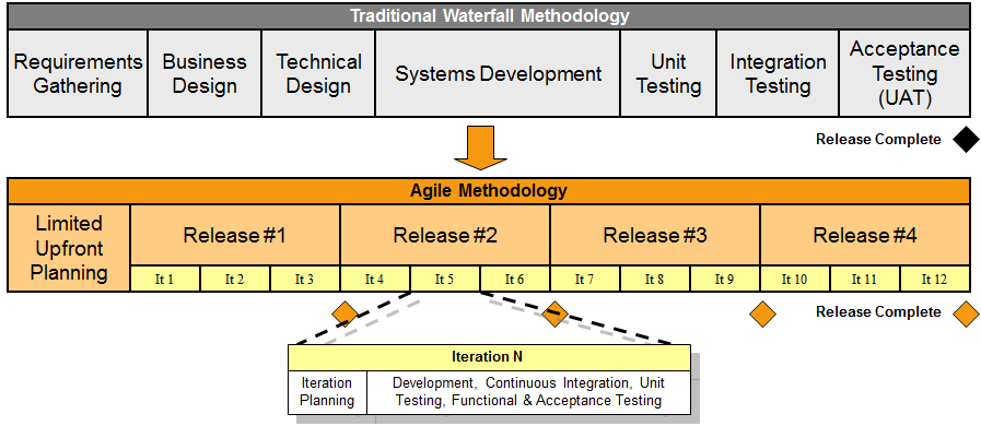 With the publication of the Agile Manifesto and the adoption of agile methodologies such as Extreme Programming, Scrum, Kanban (and now scaled frameworks), the methodologies finally caught up with the technology. When you also throw in DevOps, and the ability to take a new requirement (aka user story), have it designed, developed, testing and integrated and deploy into production many times each day, you can see how far we have come, and why agile is now the dominant methodology. However to be able to use such an approach, there are a new set of assumptions that need to be true: