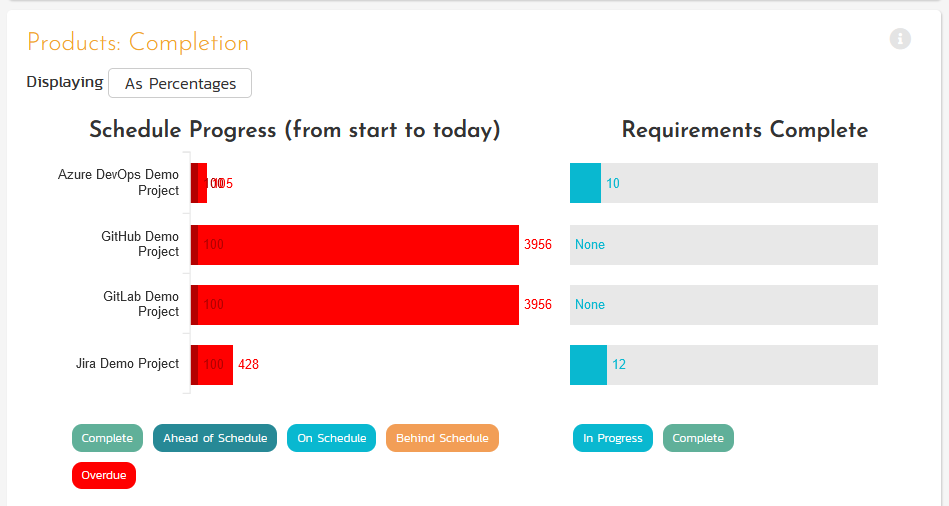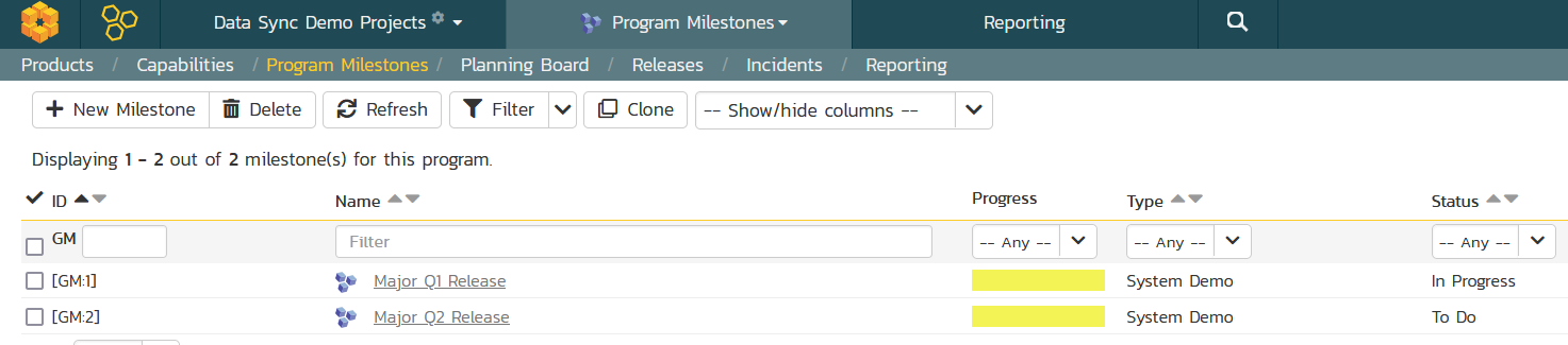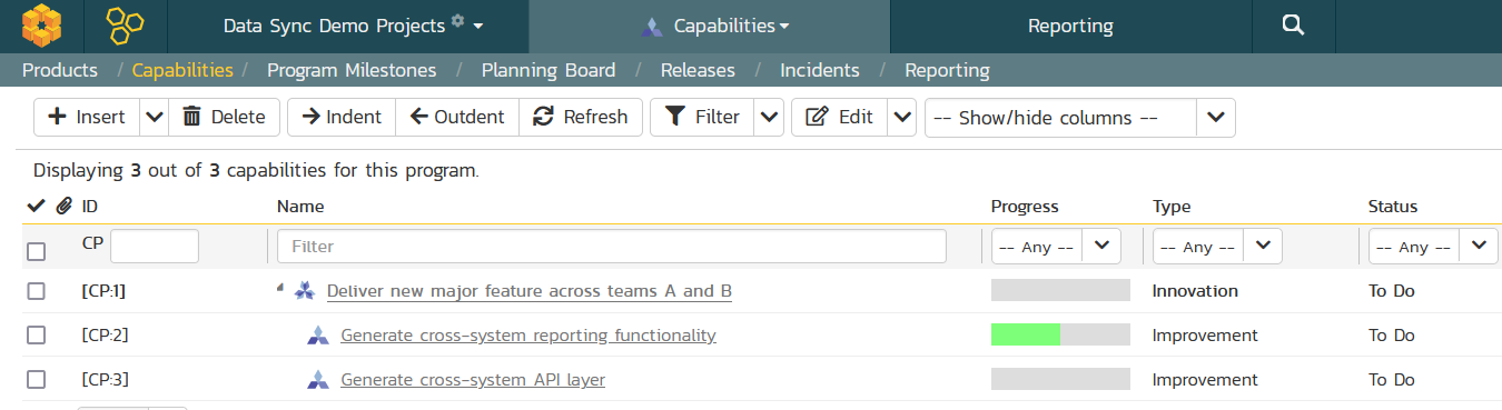 So, as the teams work in Jira and ADO to complete the various product backlog items, the overall capability status in SpiraPlan will be updated accordingly. The PMO can then plan the overall program in SpiraPlan, defining the capabilities and milestones, then leave it up to the product teams (working in Jira/ADO) to keep their status up to date. They can then get a top-down view on the progress of the capabilities. In this example, once all of the Jira/ADO backlog items are marked as completed, the progress bar of the capability in SpiraPlan will show as 100% green.