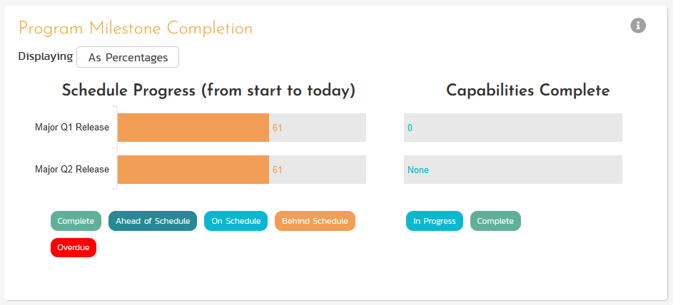 The program dashboards include several different reporting widgets to allow the PMO to see the status of the program. There is a capability view that lets you see the overall progress of the different program capabilities by milestone: