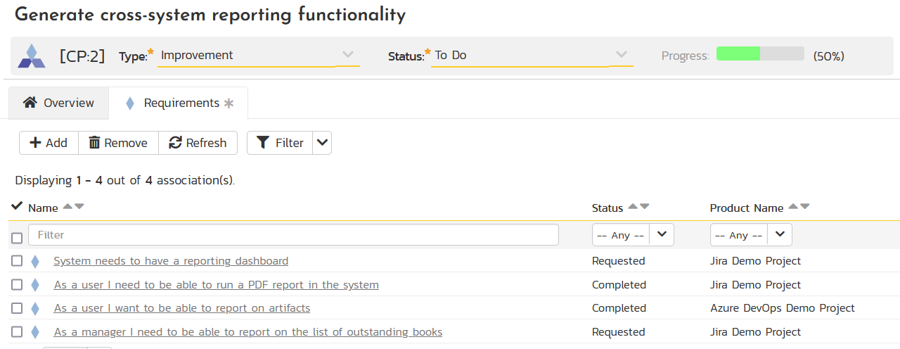 If you now drill down on the specific capability, you can see the different product backlog items (requirements) that the capabilities map to. In this example, the new program capability requires three Jira user stories and one ADO backlog item to be completed for the capability to be marked as fully complete.