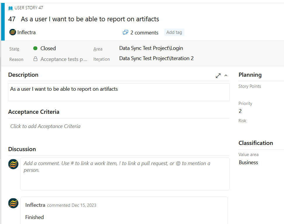 Similarly for the user story backlog item in ADO, the SpiraPlan requirement maps to it automatically: