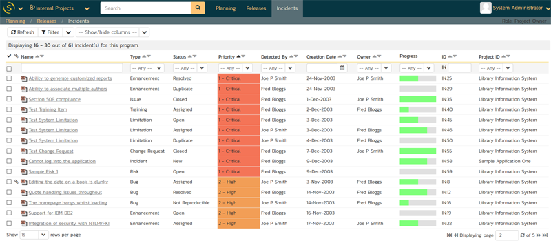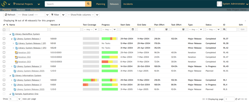This new view lets you see all of the dates and milestones for all the releases and iterations/sprints in the program. You can view and filter the releases by progress, to see all of the releases that are behind schedule, or are starting late. In addition, you can use the full range of SpiraPlan filter options to get a customized view of your entire program, from the highest level major releases, down to the individual iterations, sprints, and phases.