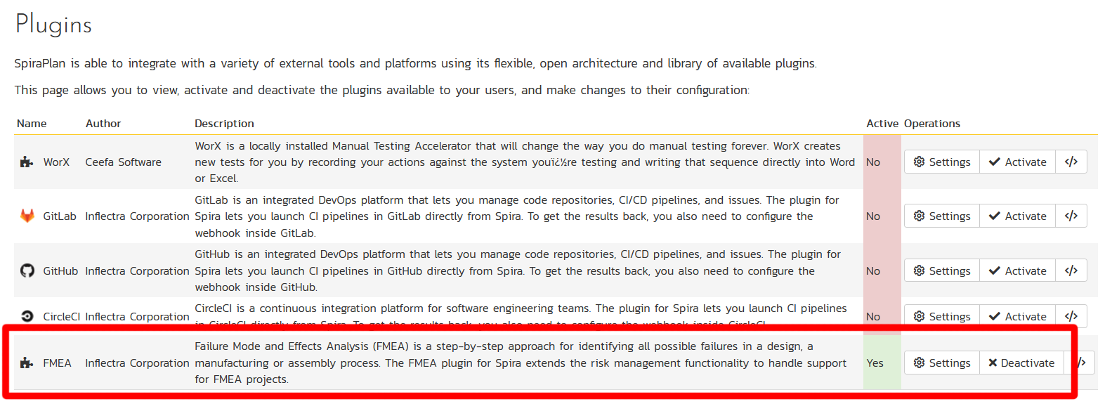 In Spira 7.0, you will be able to go to the list of plugins and active for specific products, the new FMEA plugin. This will enable the additional FMEA risk management features in the specific product: