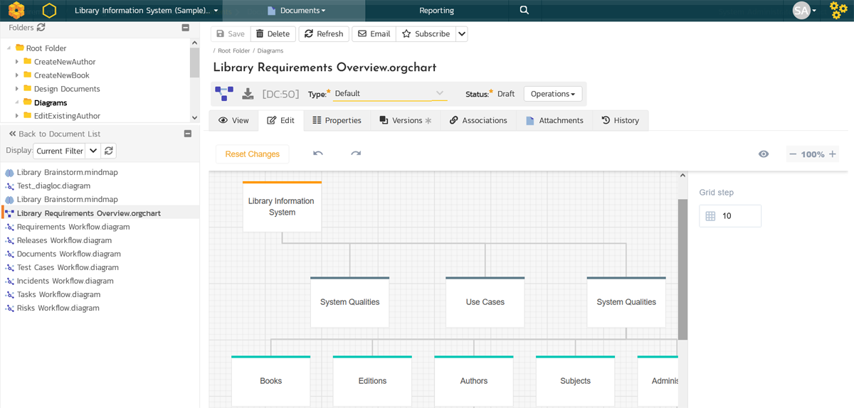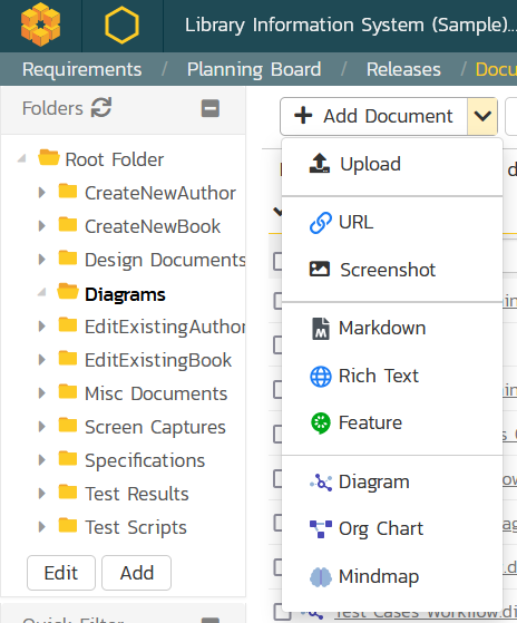 The new diagram editor is integrated into the Spira document management system. In addition to the ability to create textual content in Markdown, Rich Text, and BDD Gherkin formats, you can now choose to create three different types of diagrams in Spira: