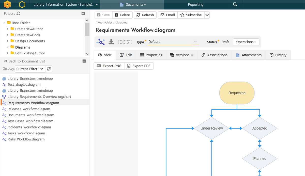 The flowchart diagram editor lets you view diagrams directly inside the system using the 'View' tab. You can also choose to export the diagrams as either a PNG graphics file or an Adobe Acrobat PDF document.