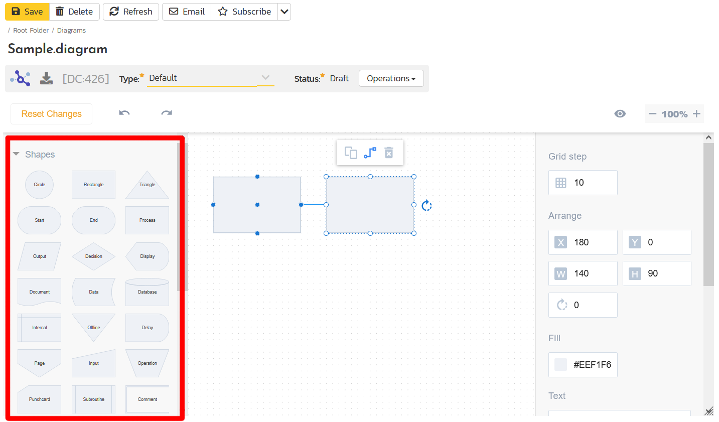 The left-hand side of the editor contains a set of shapes that you can drag into the main diagram editor. This is available for flowchart diagrams, but not for mind maps or organization charts since they have standard boxes/bubbles that are auto-styled based on the hierarchy. Once you have dragged the shapes into the main drawing grid, you can add lines or text to the items.