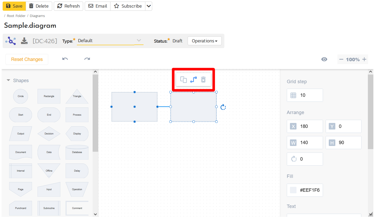 Finally, above the drawing grid is the context menu. When you select a shape, depending on the type of diagram, it will let you add new shapes, add connecting lines, and remove existing shapes.