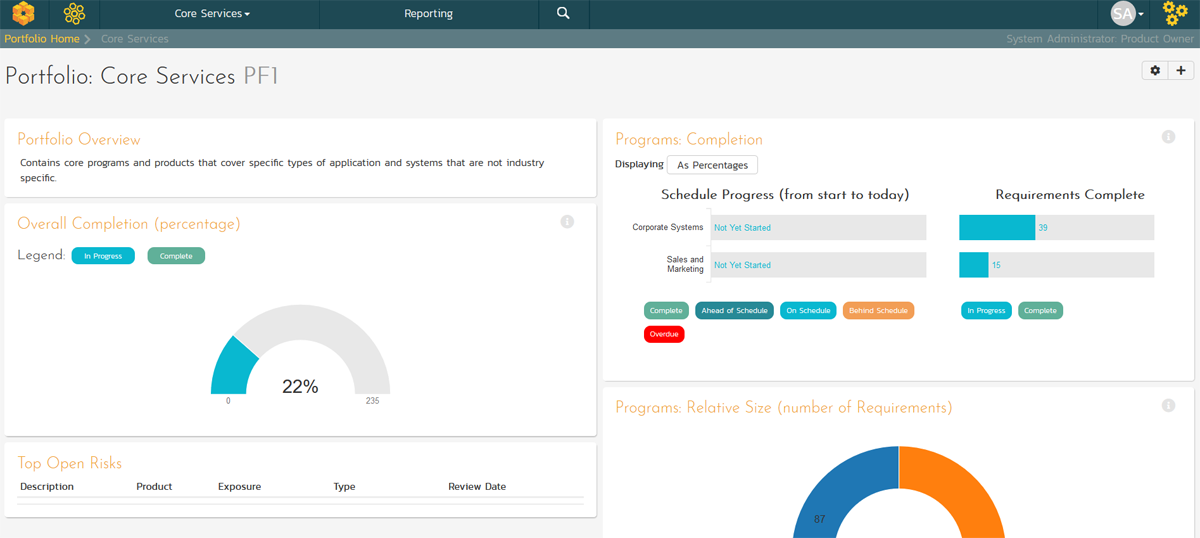 When you click on a portfolio in the navigation bar you will see the new portfolio dashboard. It includes new widgets that display the overall completion and progress of the portfolio based on how many requirements in the portfolio have been completed, as well as a breakdown by program. The dashboard also includes new widgets that show you the relative size of the programs that comprise the portfolio and a risk widget that shows you the top risks in the portfolio, sorted by greatest exposure first.