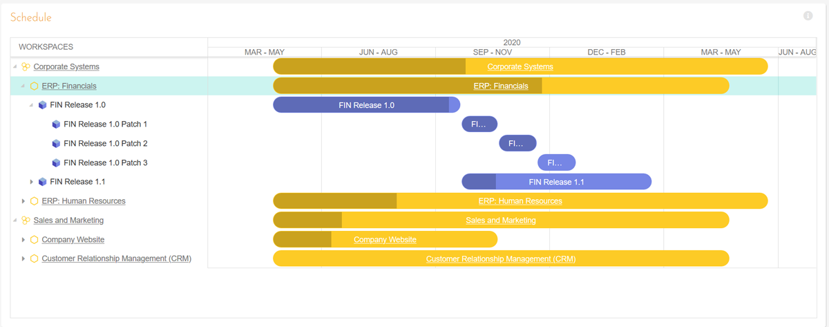 In addition, there is a new schedule widget that lets you see the hierarchy of programs, products and releases in the portfolio in a simple, color-coded GANTT chart. Each bar in the chart represents a program, product, release or sprint/phase. The bar includes a progress indicator that visually shows you what % of the item has been completed to date.