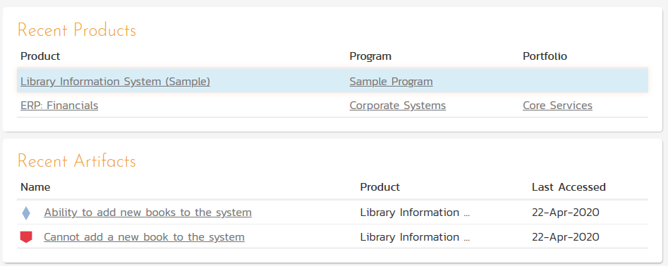 The Recent Products widget will now display the five most recent products that you have accessed, and the Recent Artifacts widget displays the last five artifacts (requirements, test cases, incidents, tasks, etc.) that you have opened. We can't wait to upgrade our internal production instance for this new feature alone!!