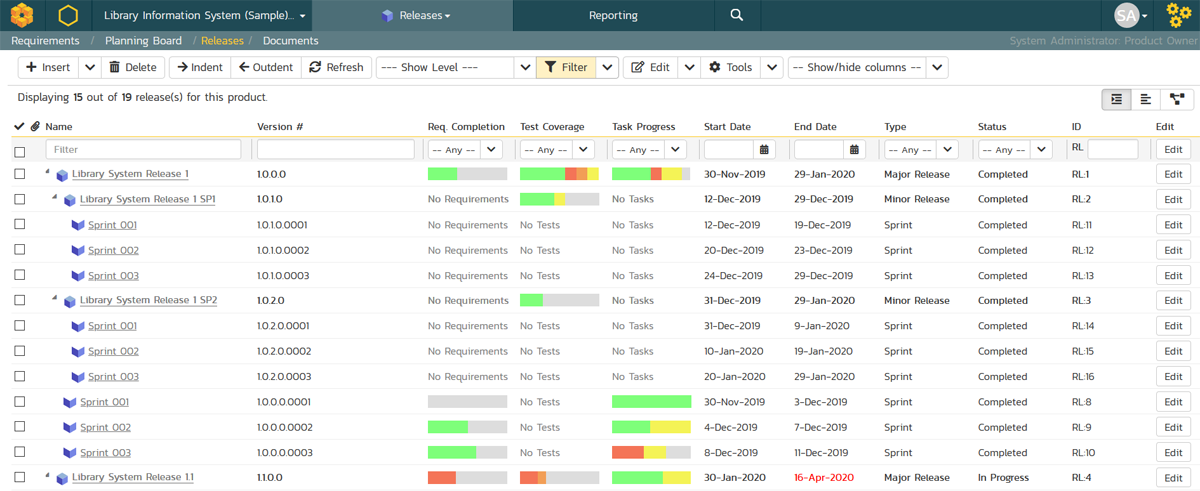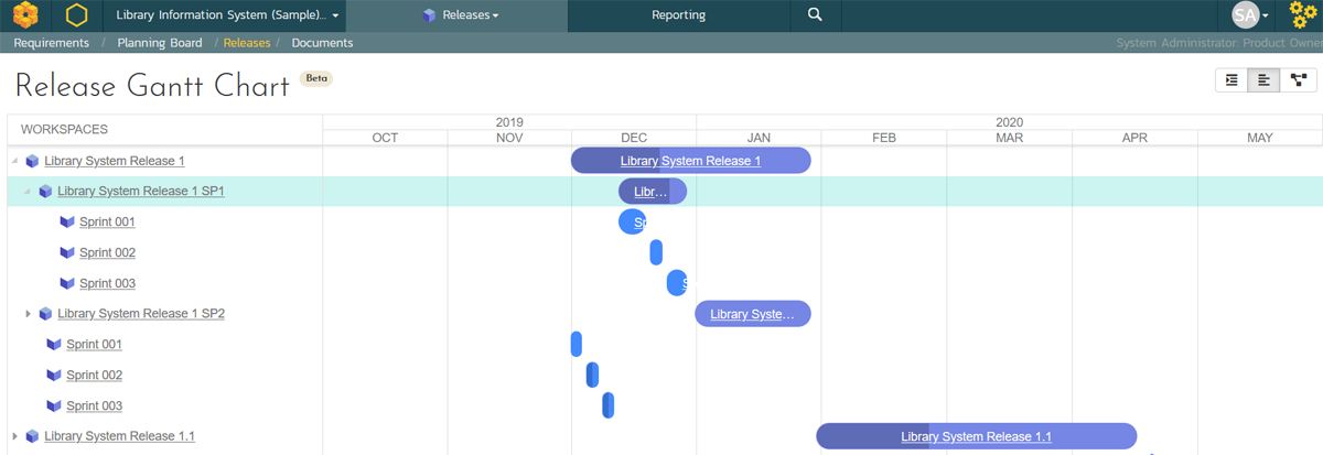 For our customers working with more traditional methodologies, we have added a GANTT chart that lets you see the hierarchy of releases and phases in a graphical view, plotted against the dates along the x-axis.