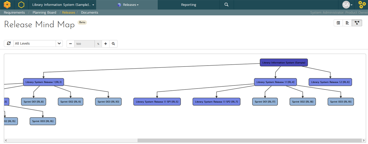 Another useful view that is now available is a hierarchical PERT chart that shows you the decomposition of releases, phases and sprints in a top-down tree diagram: