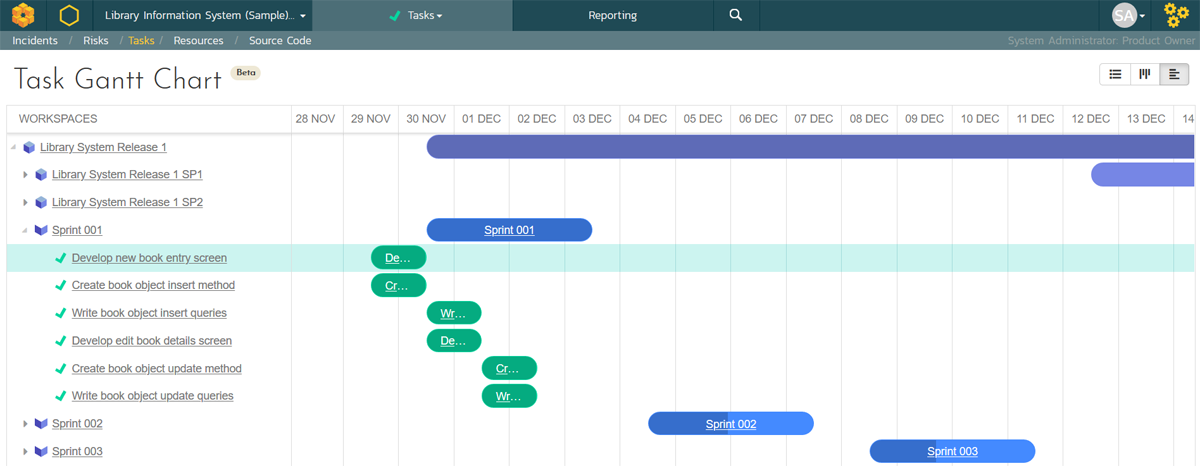 This view is similar to the GANTT chart available on the releases page, but in this view it can be drilled-down one additional level, from the releases and phases to the individual tasks in each release or phase.