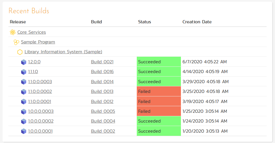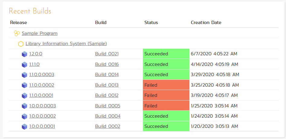 This widget shows all the active releases / sprints under each product, together with the most recent recorded build (from Jenkins, Azure DevOps, etc.) grouped by product, program and portfolio. Previously this information was only available on the product and program-level dashboards.
