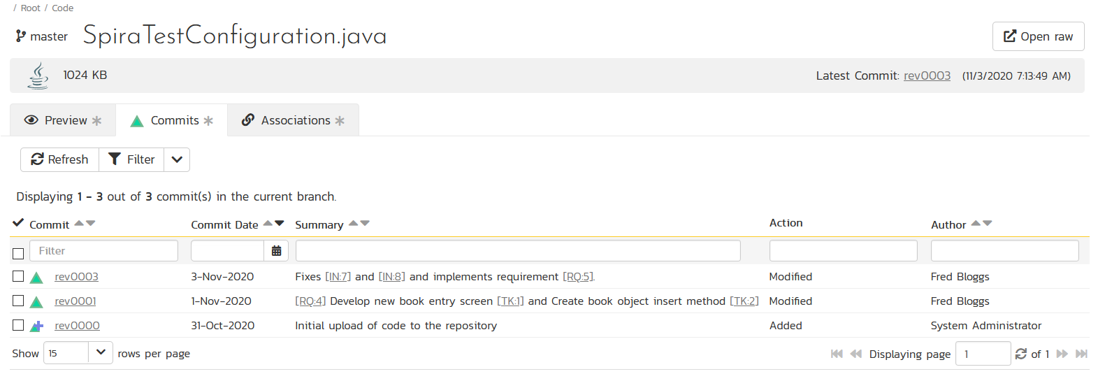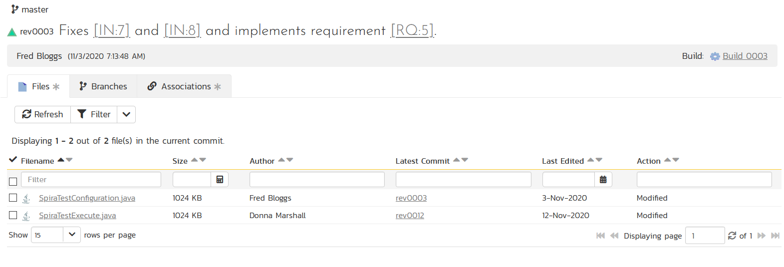 Similarly, if you are using the Developing > Source Code files pages and click on a specific file, the Commits grid will display a list of all the recent changes made to this file.