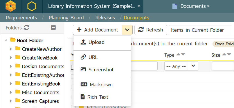 This new version of Spira changes the Add Document button to include a dropdown selector that lets you choose whether to upload a file, link to a web page, or paste in a screenshot (as was the case in previous versions), or create a markdown or rich text document directly inside Spira: