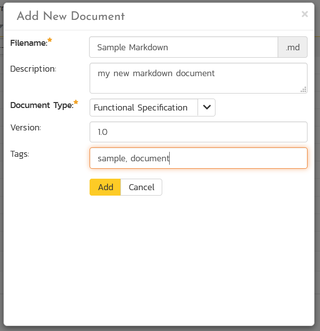 When you choose the option to create a new markdown file, you simply fill out the name of the file, the description, document type, initial version, and any meta tags: