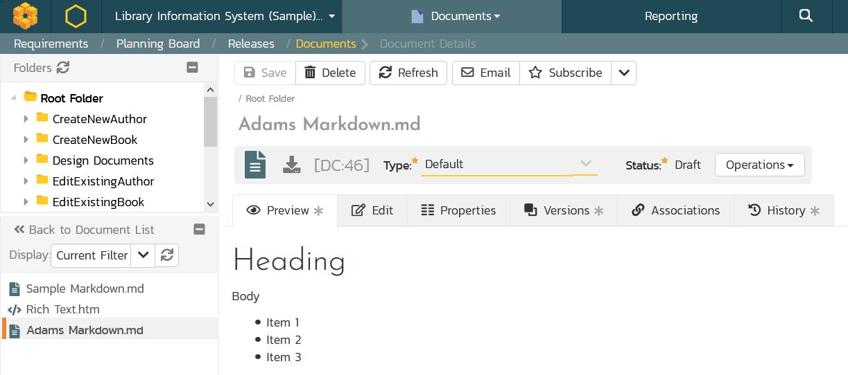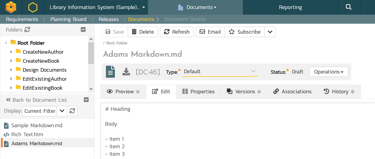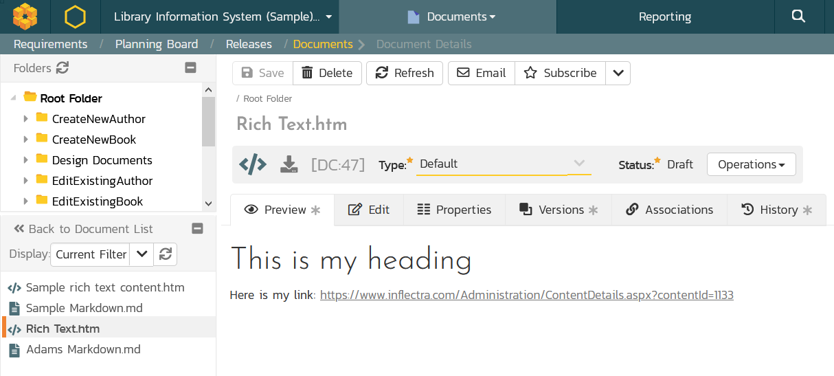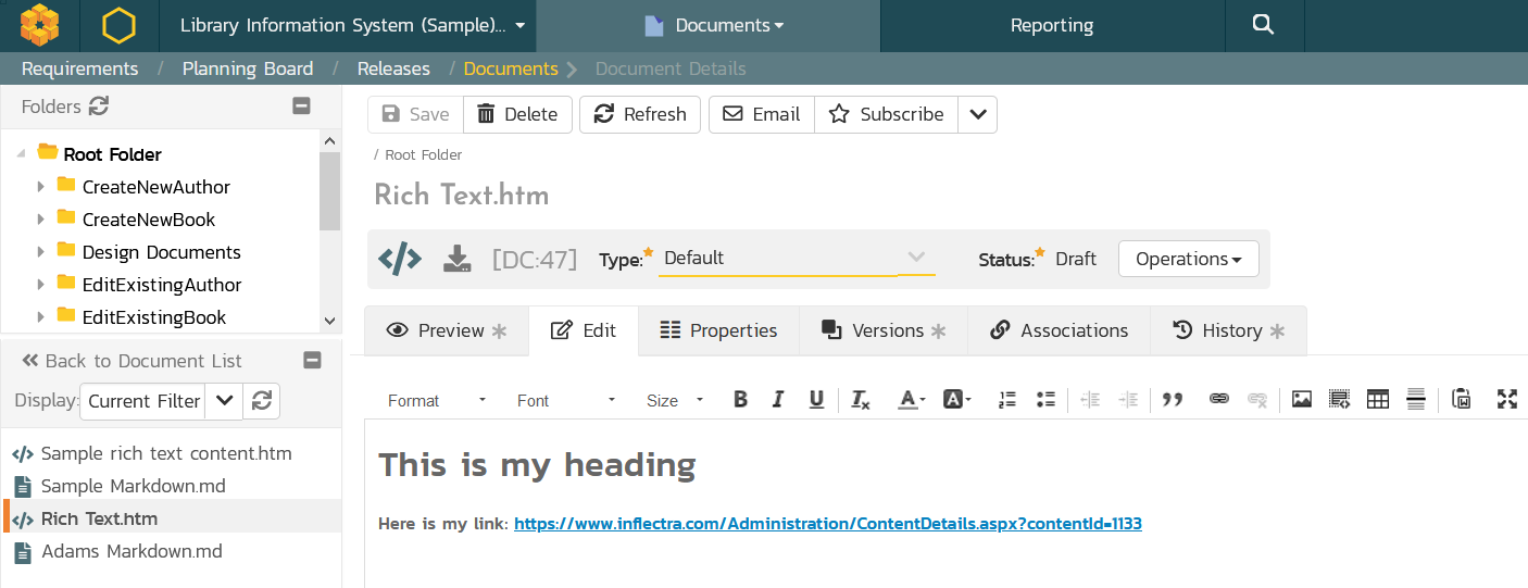 We are excited about the next release of Spira 6.8, due to be released in March. This new version includes major enhancements to the documents management module to allow users the create and edit inline content directly in Spira. Customers have asked us for ways to make authoring the unstructured, freeform content easier in Spira, similar to how they could use a Wiki, Google Docs, or Confluence page. This new functionality lets you write plain text, rich text, and markdown inside Spira and have all of the versioning and workflow capabilities at your disposal. Of course, you can link this content to your requirements, test cases, and other Spira artifacts.