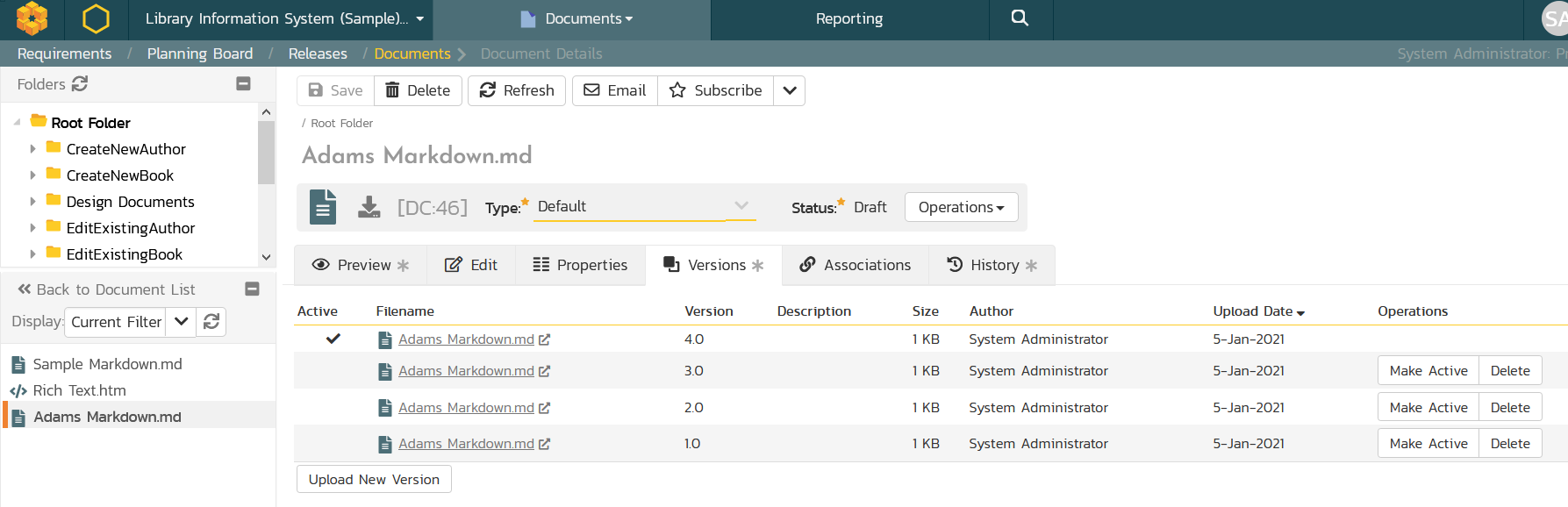 Every time you make a change, the system will keep track of the versions as well as update the latest preview. You can view the previous versions directly inside Spira: