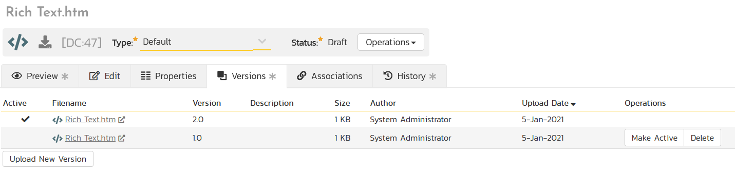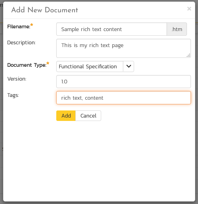 When you choose the option to create a new rich text file, you simply fill out the name of the file, the description, document type, initial version, and any meta tags:
