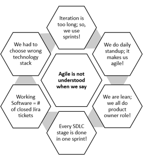 Just like how symptoms manifest as problems requiring root cause analysis, several misunderstandings of the agile framework can be seen. A few coachable moments that I have seen listed below are when leaders or team members make statements that fundamentally identify accidents waiting to happen. Each of these above statements heard in practice is troubling because people practice what they think is agile increasingly adopting behaviors going against recommended practices such as the daily collaboration with business and technical people, self-organization among teams, and technical excellence.