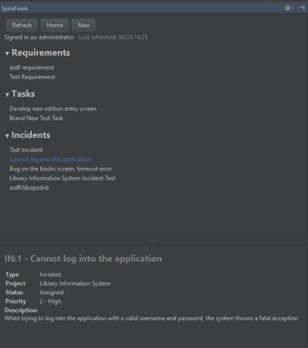Using the tool window in Jetbrains’ IDEs, we have crafted an easy way to view your incidents, tasks and requirements right from your Jetbrains IDE of choice! View the essential information fast straight from the IDE. And with a simple click you can open it up in SpiraTeam for editing and more advanced viewing.