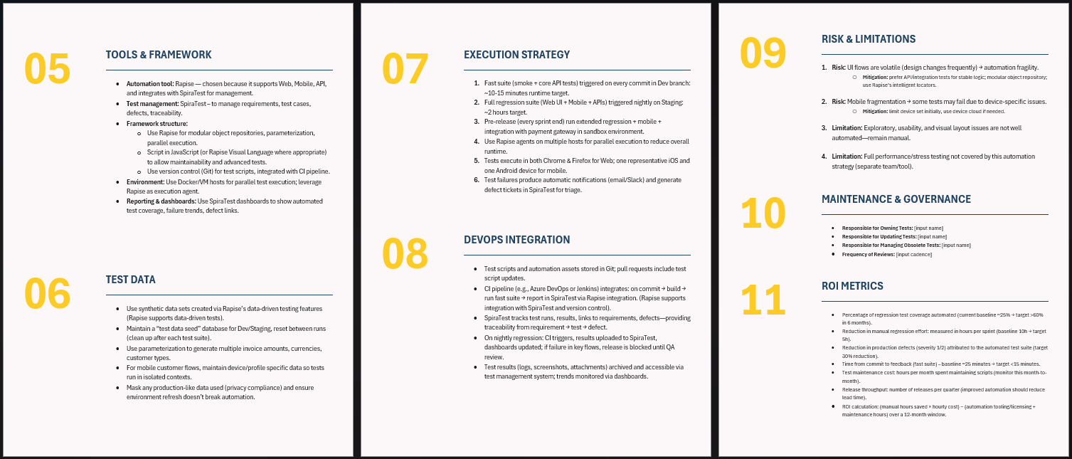 60% automated coverage target. 30% fewer high-severity bugs. Regression time cut 50%. CI feedback <15 min. Maintenance hours & release throughput tracked. |