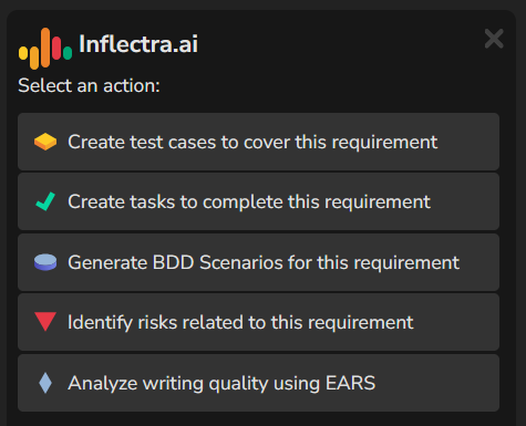 Learn More...Inflectra.ai operates natively inside Spira and Rapise to provide a dynamic set of operations based on your current context, each one delivering immediate business value:
