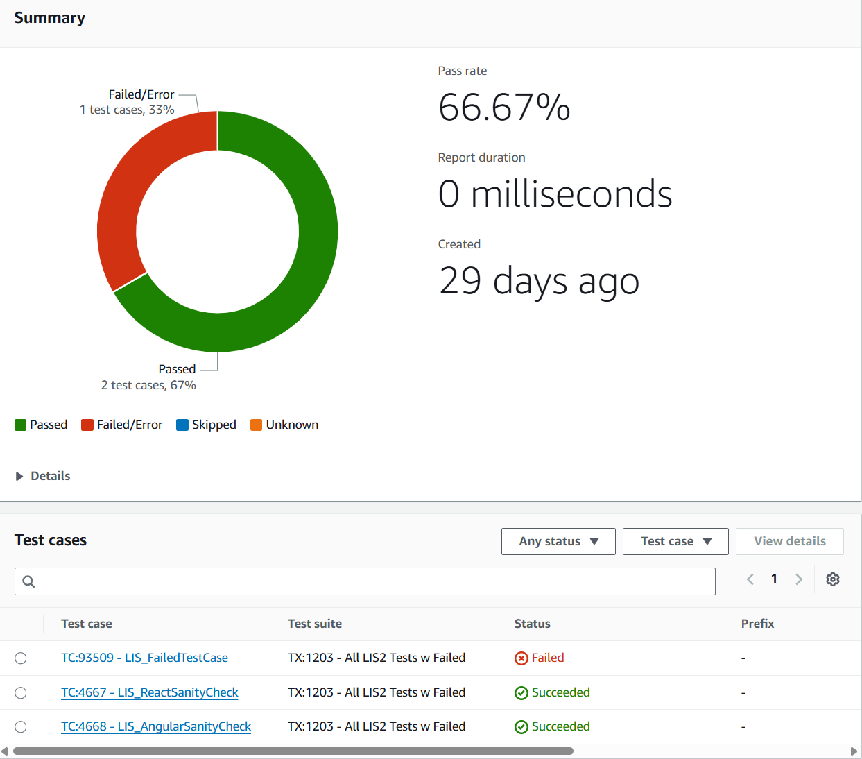 Once generated, this XML file can be consumed by your CI/CD platform. For example, AWS CodeBuild can visualize the report shows above.